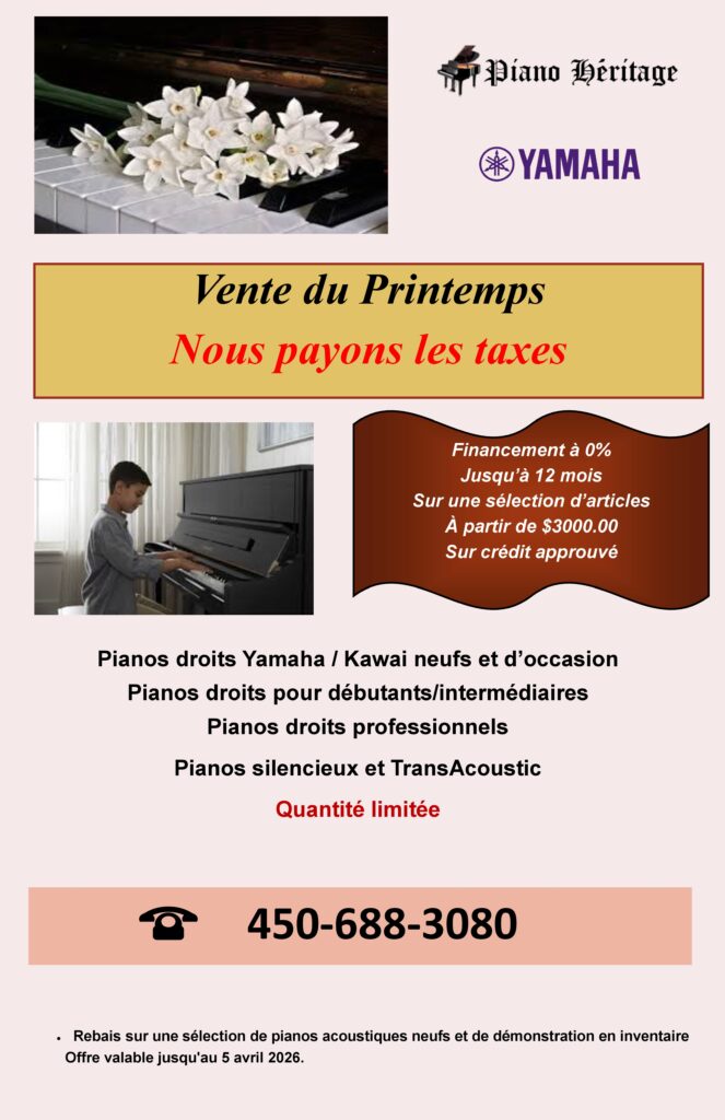 Visitez notre salle d’exposition à Laval, Québec pour essayer des dizaines de pianos acoustiques et numériques